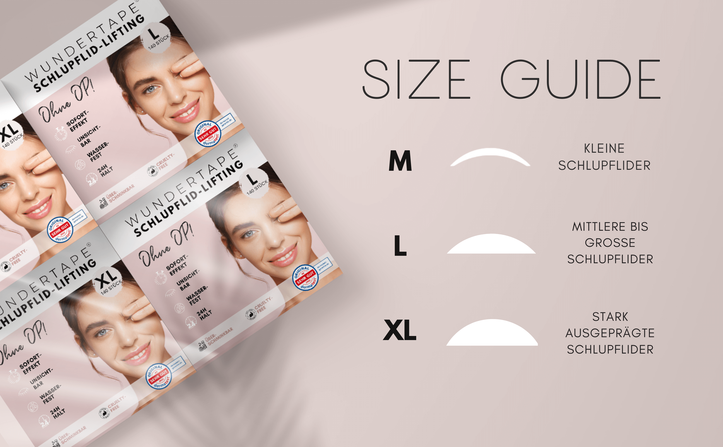 - Vorsicht bei der Tape-Größe: Nicht jedes Augenlid ist gleich. Daher gibt es die praktischen Klebestreifen auch in unterschiedlichen Größen. Bei tieferen Schlupflidern solltest Du auf etwas größere Patches zurückgreifen. Für die ideale Schlupflider Pflaster Anwendung braucht es mehr Zugkraft, damit das Lid angehoben werden kann. Ist die Lidfalte jedoch vorhanden, tun es auch kleinere Tapes.