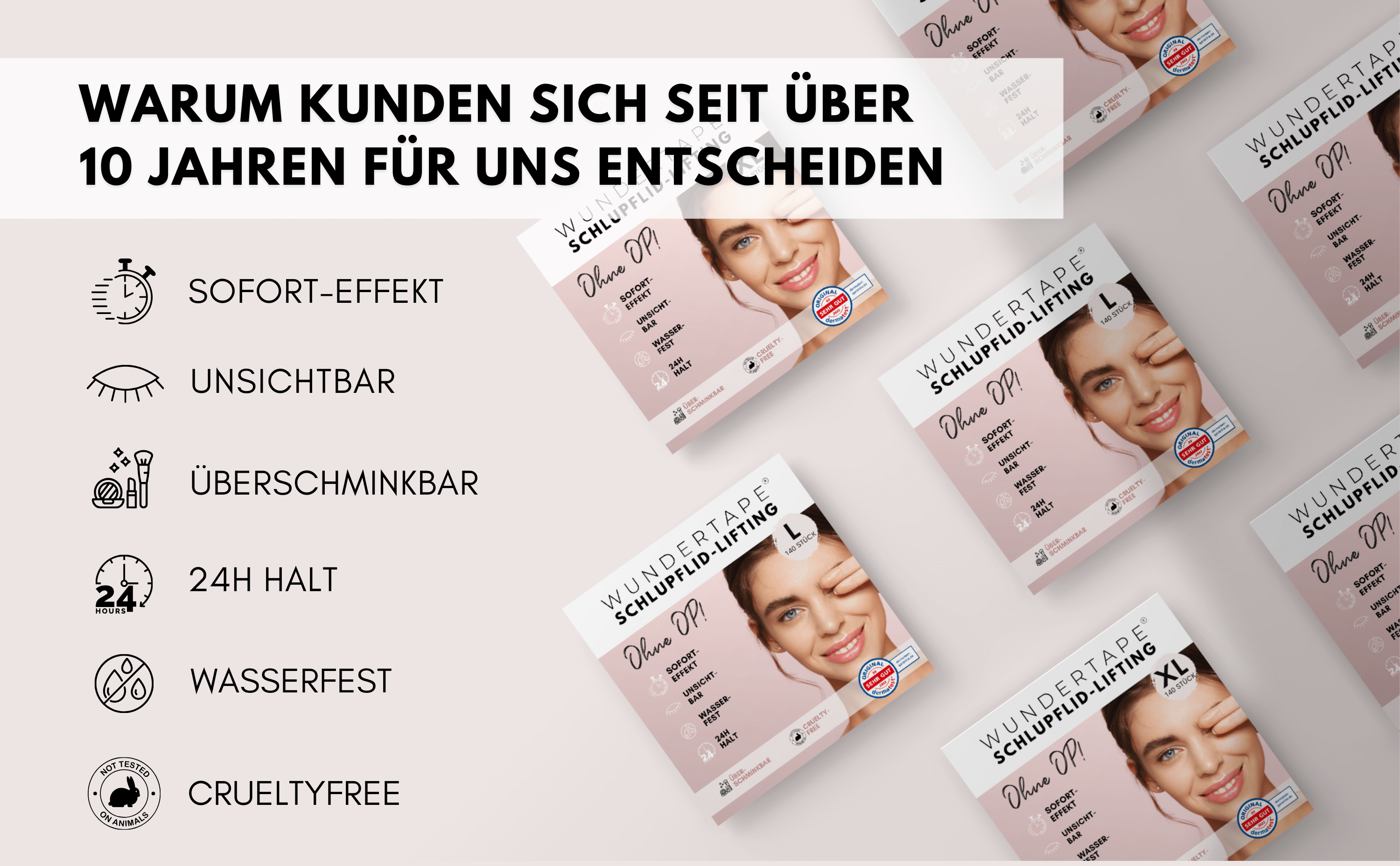 Schlupflid-Tapes erzielen ein natürliches Ergebnis und sorgen für ein sichtbares Lifting. Die Klebestreifen sind dabei so konzipiert, dass sie transparent am Augenlid sitzen und ohne viel Spannung das Lid optisch anheben. Die wichtigsten Voraussetzungen sind dabei die richtige Größe und dass Du die Technik beherrschst.