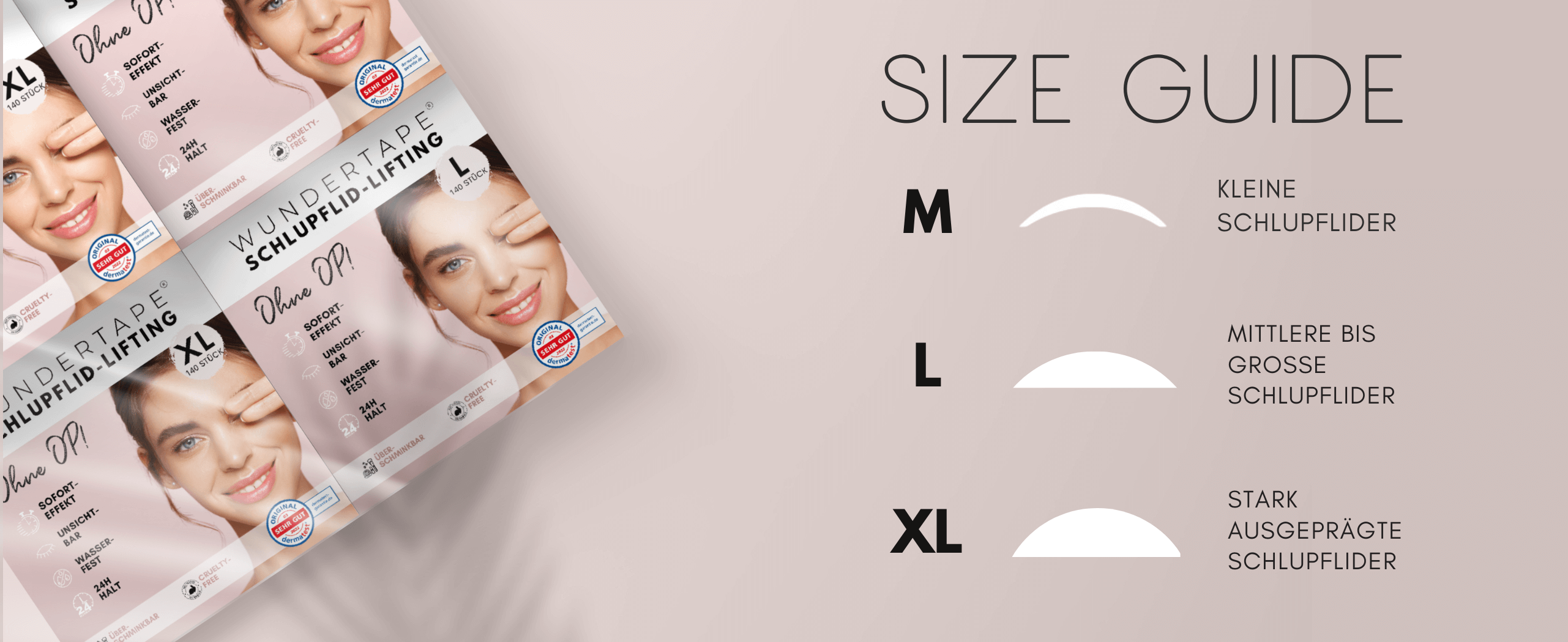 Welche Größe Dein Schlupflid-Tape haben soll, wird auch von der Dicke des Lids bestimmt. Bei dünneren Lidern greifst Du zu kleineren Tapes, bei etwas dickeren Lidern empfehlen wir ein entsprechend größeres Tape. So erzielst Du den gewünschten Lifting-Effekt.